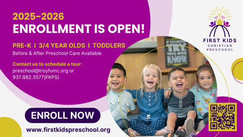 Want to tour the preschool? Contact us at preschool@troyfumc.org or 937-882-3577(FKPS). We would love to show you our classrooms and answer your questions about our program! If you decide to enroll, you will have an opportunity to fill out the registration form and pay the registration fee in person during your tour.