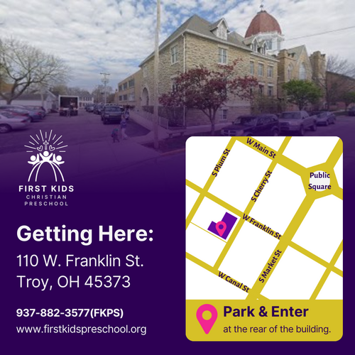 Our preschool is a ministry of Troy First United Methodist Church, located in historic Downtown Troy. We are located on the corner of W. Franklin St. and Cherry St. Look for the red dome with the cross to find us. Park in the lot behind the church and enter at the rear of the building, as shown on the right.