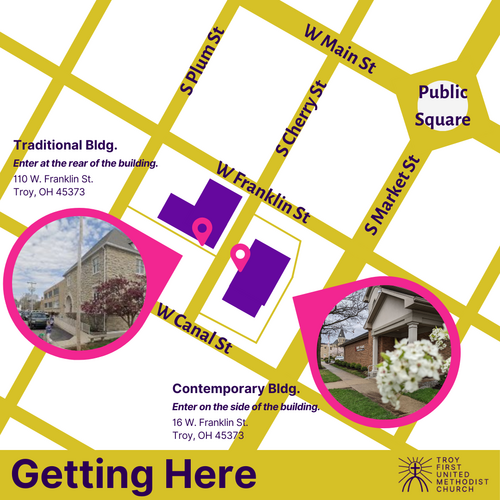 At Troy First United Methodist Church, our Traditional Building located at 110 W. Franklin St., in Troy, is home to our Traditional Worship Services. Across the street, First Place Christian Center, our Contemporary Building, located at 16 W. Franklin St., in Troy, is home to our Contemporary Worship Services.