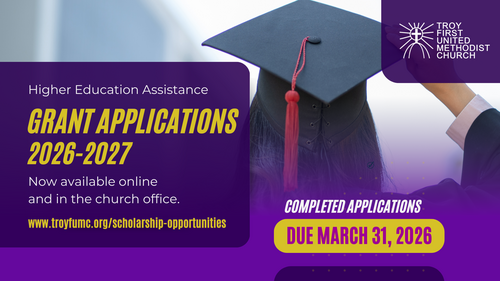 Applications for higher education assistance grants from Troy First UMC for the upcoming academic school year are currently available here online or in the church office. Deadline for Completed Applications is Monday, March 31, 2026. Completed applications must be submitted to the church office. It is in the best intention of the HEAC to award these grants as soon as possible, however, it could take up to 45 days, or more, after the application due date. Questions may be addressed to the church office at 937-335-2826.